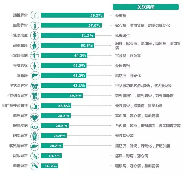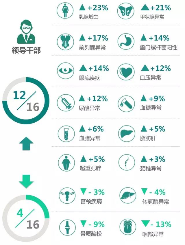 16类指标中,2016年领导干部样本人群的指标异常检出率比2014年升高的共有12项,即3/4的健康指标在领导干部群体中的呈恶化趋势,其中最严重的是女性乳腺增生和甲状腺异常,指标异常率从 2014年到2016年的年复合增长20%以上。仅有4项指标的增长率呈下降趋势,分别是女性的宫颈疾病、转氨酶异常、骨质疏松和咽部异常。