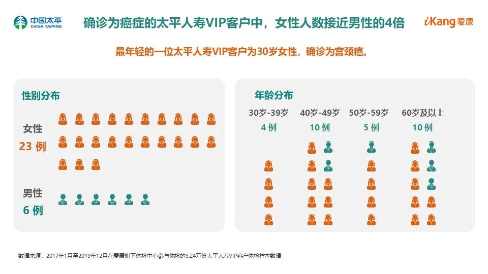在2017年至2019年参与体检的太平人寿VIP客户中,爱康集团通过有人“管”的体检的追踪和随访,目前已经发现29位客户患有癌症(由三甲医院确诊)。其中,肺癌确诊人数最多(13人),往下依次为宫颈癌(8人)、甲状腺癌(3人)、乳腺癌(3人)、膀胱癌(1人)和肾癌(1人)。多数确诊VIP客户在40岁-49岁和60岁及以上年龄段,均为10人。最年轻的确诊太平人寿VIP客户年仅30岁,为宫颈癌。