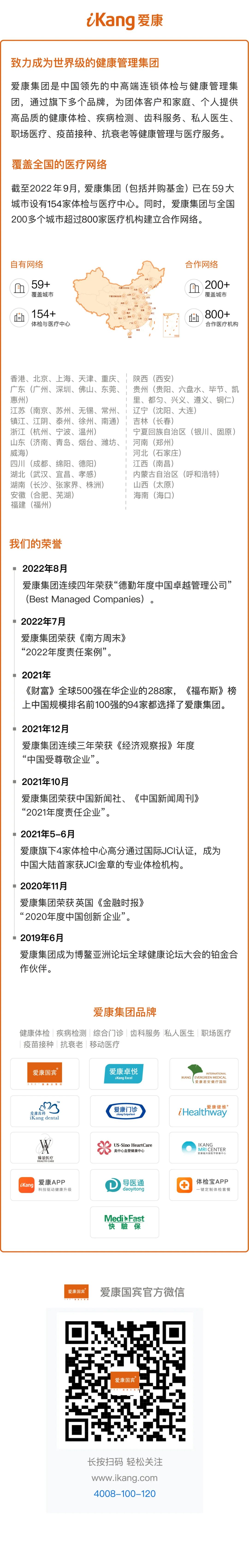 2022年,爱康还将试点创立爱康心康中心、爱康乳腺健康管理中心、爱康青少儿健康成长中心,希望能为生命的各个阶段提供全方位的健康保障。