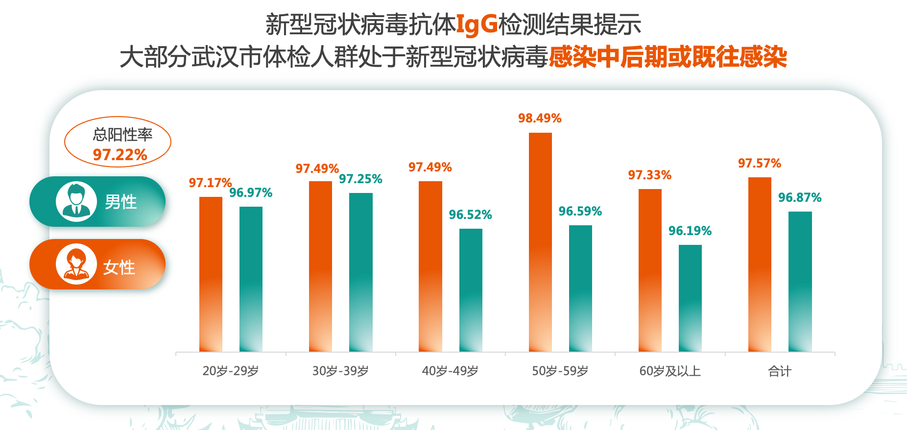 根据2023年2月1日至3月31日两个月内近万份样本的检测显示,武汉市体检人群中抗体lgM阳性的检出率为5.55%,提示在检测期间仍存在一定数量的人群正在经历新型冠状病毒感染。lgG阳性的检出率为97.22%,提示在检测期间大部分武汉市体检人群处于新型冠状病毒感染中后期或既往感染。武汉市体检人群中抗体lgM和lgG同时阳性的检出率为5.56%,提示在检测期间仍存在一定数量的人群正处于感染恢复期。
