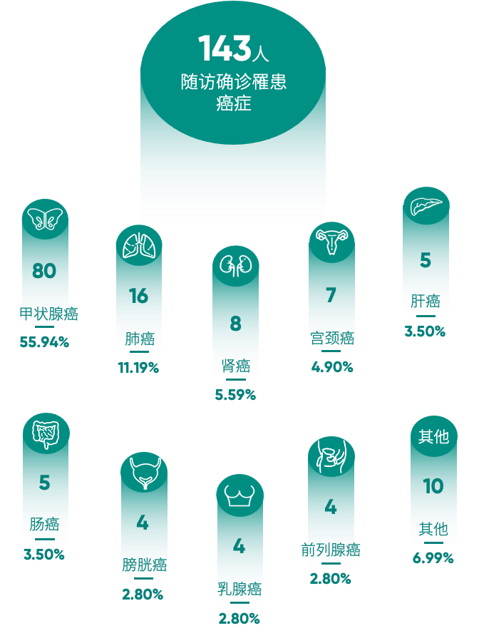 癌症作为人类健康的“第一杀手”,已成为热搜上的“常客”。在西安市14.7万的体检人群中,爱康集团至少随访到143人确诊癌症,其中甲状腺癌为最高发为80人,其次是肺癌,肾癌,宫颈癌,肝癌等。