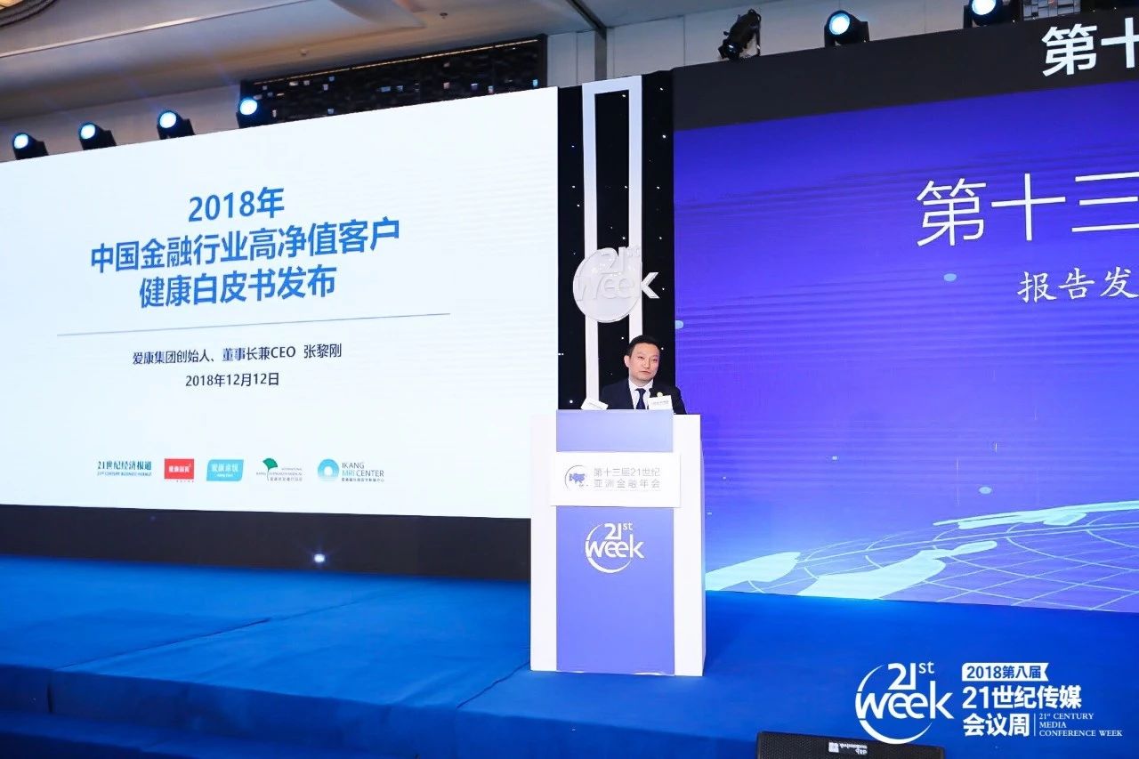 12月12日上午,爱康集团创始人、董事长兼CEO张黎刚在《21世纪经济报道》主办的“第十三届亚洲金融年会”主论坛上发布《中国金融行业高净值客户健康白皮书》报告,与到场的各大金融机构高层们分享了一些健康建议。